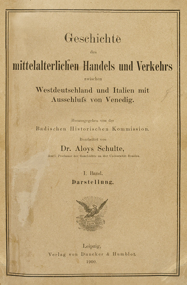 Im Jahr 1900 veröffentlicht der deutsche Archivrat und Mediävist Aloys Schulte ein zweibändiges, über tausend Seiten zählendes Werk: Geschichte des mittelalterlichen Handels und Verkehrs zwischen Westdeutschland und Italien mit Ausschluss von Venedig. Über zehn Jahre hat er an dem Buch gearbeitet, das trotz dem sperrigen Titel ein ökonomischer Erfolg wird. Im Vorwort gibt der Autor seiner grossen Erschöpfung Ausdruck: «Mit einiger Resignation nehme ich von dem Buche Abschied. Es wird mir genügen, wenn es der Forschung auf diesem weiten Felde der Handelsgeschichte einen neuen Impuls giebt.»