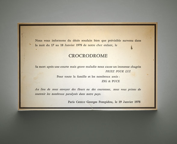 «also heute beginn mit dem crocrodromabriss», vermerkt der seit den ersten Tätigkeitsjahren minutiöse Tagebuchschreiber Bernhard Luginbühl am 2. Januar 1978 in sein neues Diarium mit dem Titel «Ruckzuck Luginbühl». In Kleinbuchstaben und schülerhaft geschwungener Schreibschrift, voller Wortwitz und mit rastloser Energie berichtet er darin von den Ereignissen rund um die Zerstörung der Monumentalplastik «Le Crocrodrome de Zig et Puce». Auch in Luginbühls Notizheften der Jahre 1977–78 finden sich Hinweise auf das Entstehen und Vergehen der gigantischen, begehbaren Installation. Seit dem 1. Juni 1977 wird diese in der Eingangshalle des Centre Pompidou gezeigt und übernimmt als jahrmarktartige Attraktion für Kinder und Erwachsene eine wichtige Funktion im Eröffnungsjahr des revolutionären Museumsbaus.