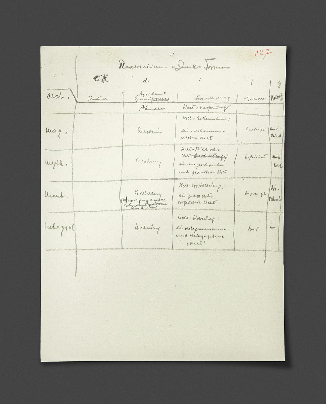Das Bild zeigt ein Blatt aus dem Nachlass des Philosophen Jean Gebser (1905-1973). Es handelt sich um den Entwurf eines synoptischen Quer- und Längsschnitts, der erweitert und ergänzt seinen Platz in Gebsers Hauptwerk Ursprung und Gegenwart gefunden hat. Dieses zweibändige Werk wird in diesem Herbst im Chronos Verlag neu herausgegeben.