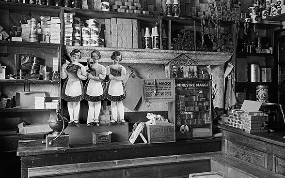 Ein schönes Beispiel ist eine Werbetafel für die vor 120 Jahren erfundene «Ovomaltine». Die Form der Tafel ist ausgefallen: sie ist nicht rechteckig, sondern folgt im oberen Teil der grafischen Gestaltung. Dort ragt das Design der Ovomaltinedose heraus, fast so gross wie der untere Teil des Schildes. Die Zutaten des Getränkepulvers sind einzeln dargestellt, begleitet von einer prägnanten Werbebotschaft, welche das Produkt als nützlich für Kleinkinder anpreist. Für die Kundschaft, die zum Kauf der Ovomaltine ermuntert werden sollte, wurde schnell offensichtlich, was drin war: Getreide, Milch, Eier und Kakao. In Verbindung mit dem Text ist die Botschaft eindeutig: Ovomaltine ist gesund und trägt bereits bei Einjährigen zu einer gesunden Lebensweise bei.