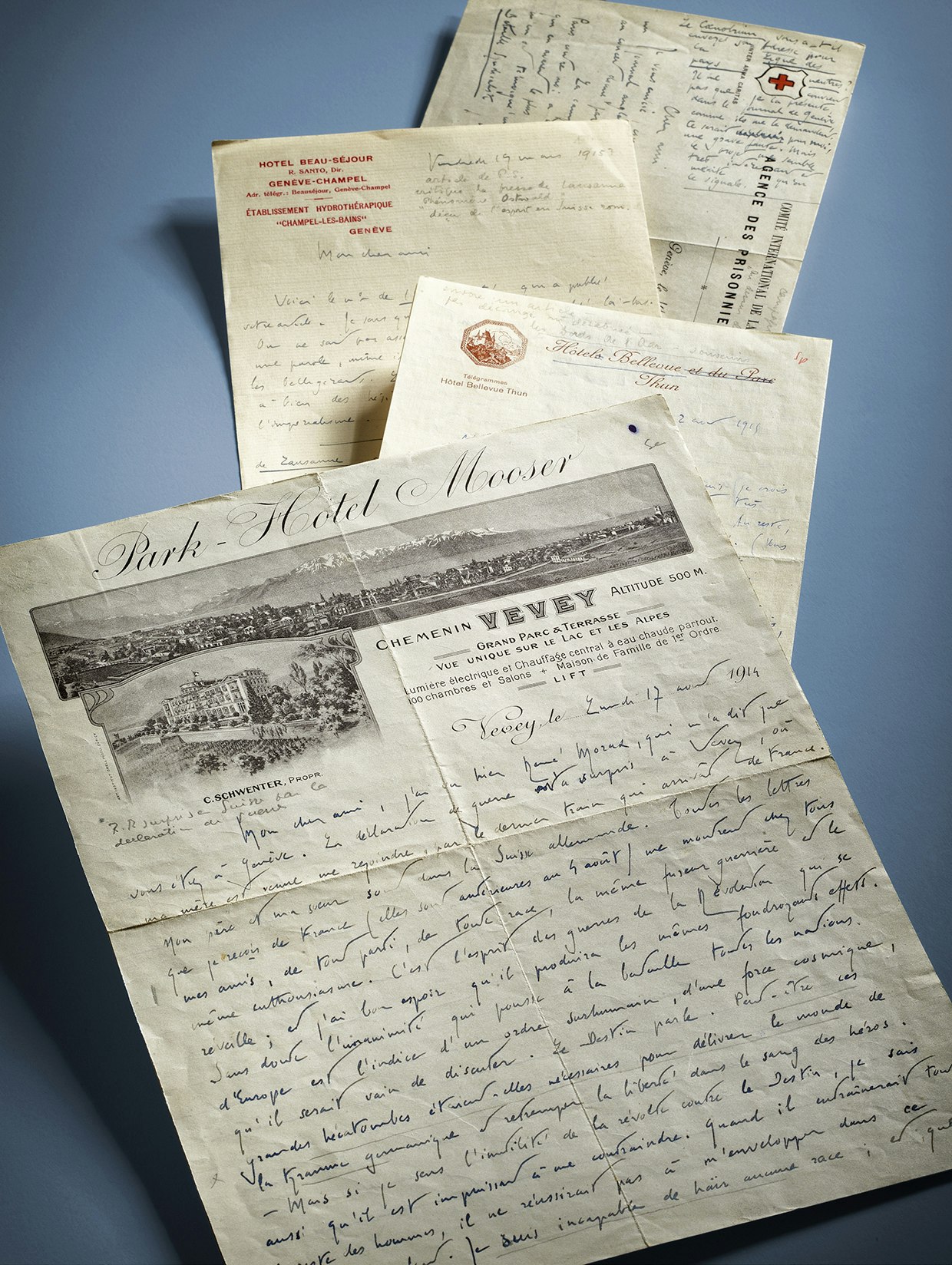 « cruelles angoisses, les premiers jours où il a fallu chercher [sa] voie au milieu de ce champ de bataille », qui justifient le retrait de Rolland. À l'exception de son Journal des années de guerre, auquel il se confie, cette lettre à l'en-tête du Park-Hôtel Mooser de Vevey constitue ainsi une des premières « prises de parole » du Français, un mois exactement avant la remise au Journal de Genève du texte Au-dessus de la mêlée qui fera de lui un écrivain