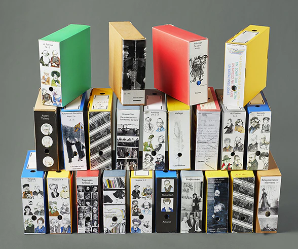 Yvonne Böhler hat über 250 Autorinnen und Autoren fotografiert. Die vielen Bilder sortierte die Fotografin in säuberlich beschriftete Schachteln, dekoriert mit Karikaturen.
