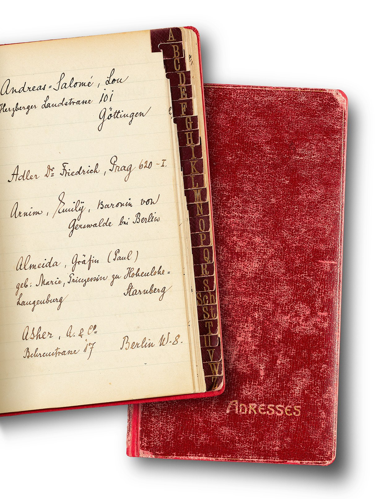 Dieses hat er gemäss eingeklebter Etikette bei der Firma F.A. Prantl in München erstanden. Es ist ein ansehnliches, sehr gediegen wirkendes Buch aus einem karmesinroten, wattierten Spaltledereinband, versehen mit der in goldenen Lettern gehaltenen Aufschrift „ADRESSES“. Es sind auf 153 Seiten über 1‘000 Namen und Adressen eingetragen, beginnend mit Andreas-Salomé, Lou, die Rilke 1897 in München kennengelernt hatte. Mit ihr unternahm er seine beiden Russlandreisen, die für sein literarisches Schaffen prägend und erweckend sein sollten. Der letzte Namenseintrag im vorgegebenen alphabetischen Verzeichnis lautet: „Zesewitz, Hans, Stadtbibliothekar Hohenstein-Ernstthal“. Dazwischen stösst man auf Adressen mit Angaben von Orten, die Rilke bereist hatte – quer durch Europa, von Moskau nach Paris und von Stockholm nach Rom. Darüber hinaus notierte er sogar Adressen auf dem amerikanischen und dem australischen Kontinent: in New York, Mexiko, Buenos Aires, Melbourne.