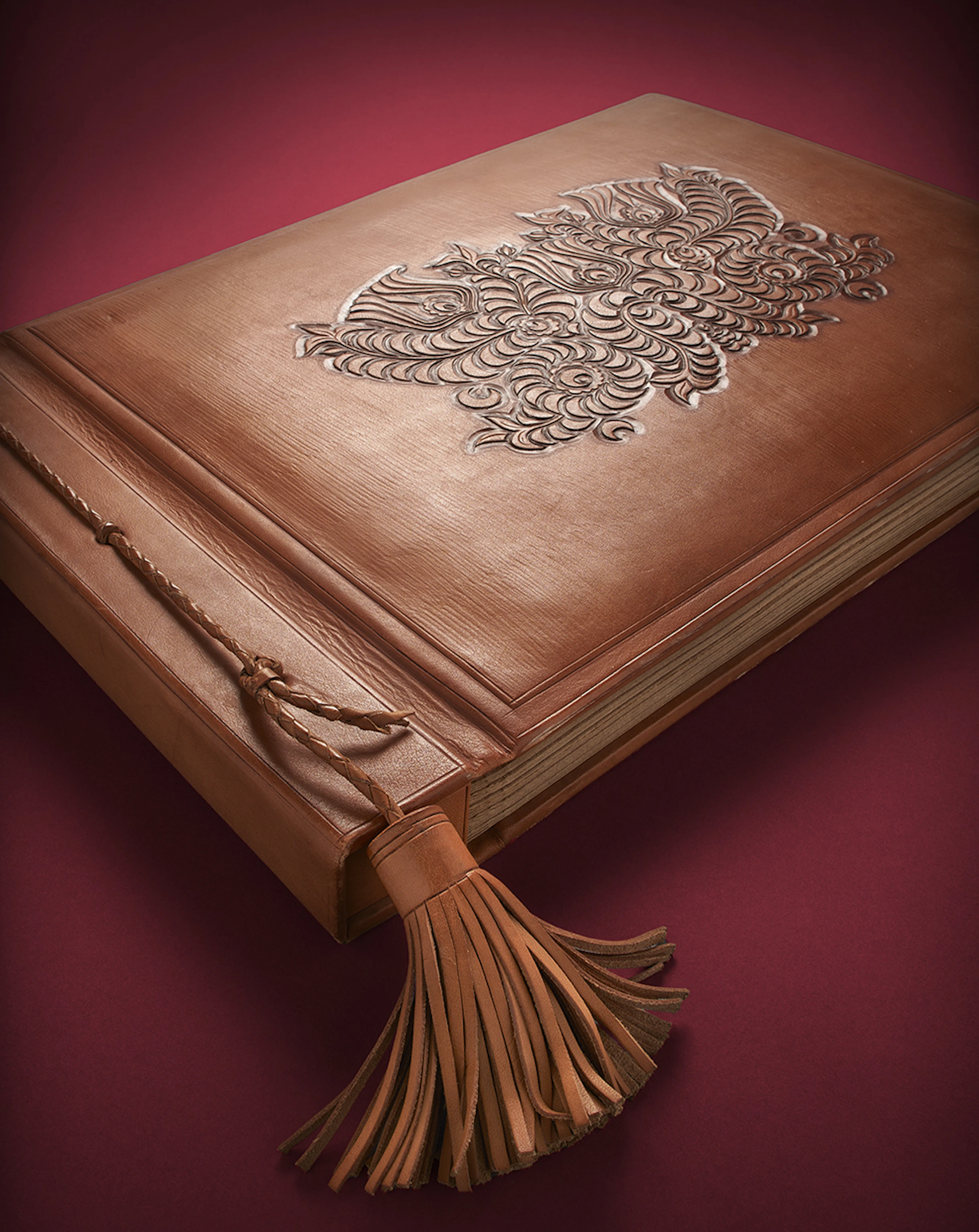 Man hat zu Ehren des grossen Dichters keinen Aufwand gescheut: Die zwei Dutzend Albumblätter bestehen aus schwerem braunem Papier und beinhalten knapp vierzig stimmungsvolle, teils mit adretten (deutschsprachigen) Legenden versehene Fotografien, geschützt durch feine Pergamin-Blätter. Zusammengehalten wird das Ganze von einer Kordelbindung. Front und Rücken des massiven, mit Leder bezogenen Einbands dekorieren eigenwillige, in präziser Handarbeit bewerkstelligte florale Schnitzverzierungen.