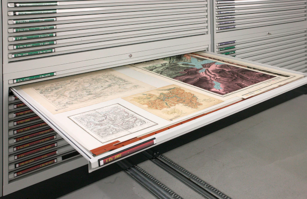 The stacks are equipped with 14-metre-long mobile shelving (a world first) and drawers. To save space and maximise the available area, 98% of the installation is mobile and was custom-made to accommodate the dimensions of the various collections.
