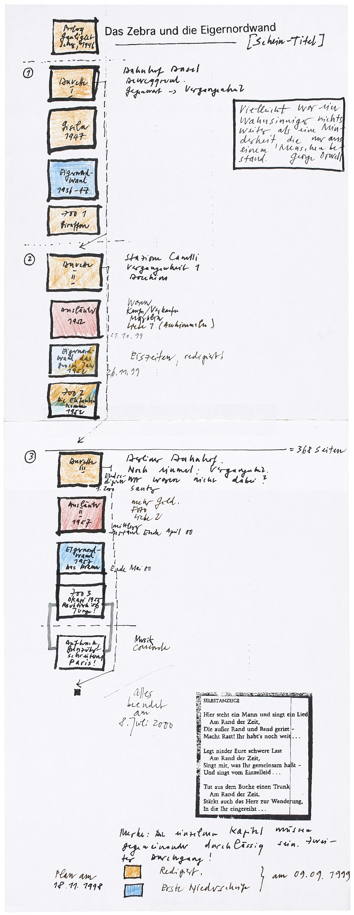 Das Erzählgerüst «Das Zebra und die Eigernordwand» weist eine Matrixstruktur auf. Die horizontalen gestrichelten Linien markieren die drei Teile des Buches, Datierungen den Schreib-Fahrplan, neben den (Themen-)Kästchen stehen stichwortartige Inhaltsangaben. «Liebe 1 (Anhimmeln)» neben dem roten Kästchen Ausläufer 1952 bedingt Kästchen «Ausläufer II 1957», in dem es nebst der «Liebe 2» um «mehr Geld» im Haushalt der jungen Familie geht. Zebra wie Eigernordwand sind Zeichen für Frieden und Krieg. Zebra steht für den von Grimsel so oft besuchten Basler «Zolli», Fluchtort und Gegenwelt; die Tierwelt kennt keine Kriege.