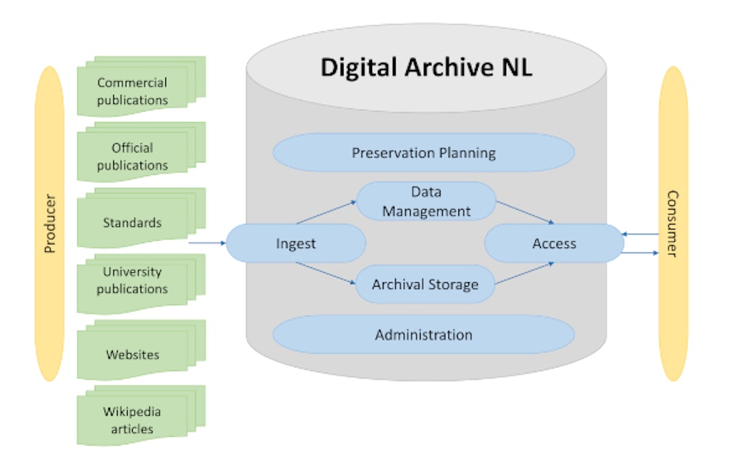 The long-term archive is based on the Open Archival Information System (OAIS).