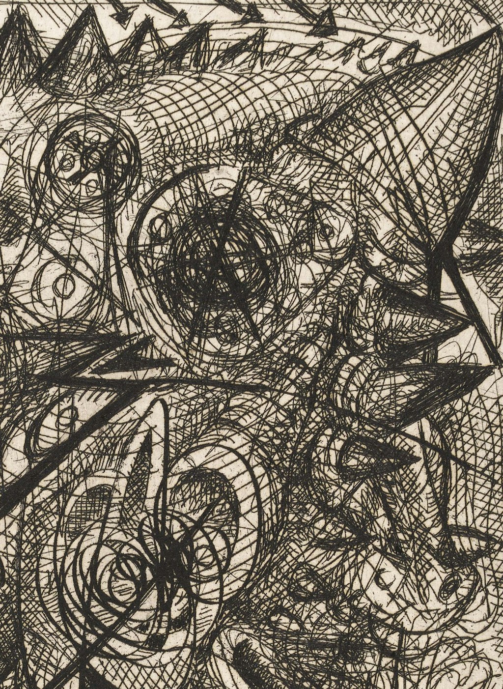 The three works share a kind of blended authorship within the medium of printmaking. This is because Jean Tinguely and Bernhard Luginbühl both engraved the underlying printing plates. This involved the metal plates being passed back and forth between the artists for months and being reworked many times. The network of lines engraved onto the metal plate therefore grew steadily thicker, layer by layer. This can be seen in ‘Dornier‘. The copper etching was released for the first time in 1988 in a numbered print run of 20 copies, signed by Luginbühl and Tinguely, Over time, from the abstract lines emerged a reptilian, horned creature, with jagged spines and spikes. Are the clear, solid lines the work of Luginbühl and the fine, sketchy ones by Tinguely? In retrospect, it is difficult to distinguish the work of one artist from the other. The haphazard, instinctive interaction plays a key role in this collaborative work – not dissimilar to the surrealist exquisite corpse method, a collaborative drawing game using folded paper.