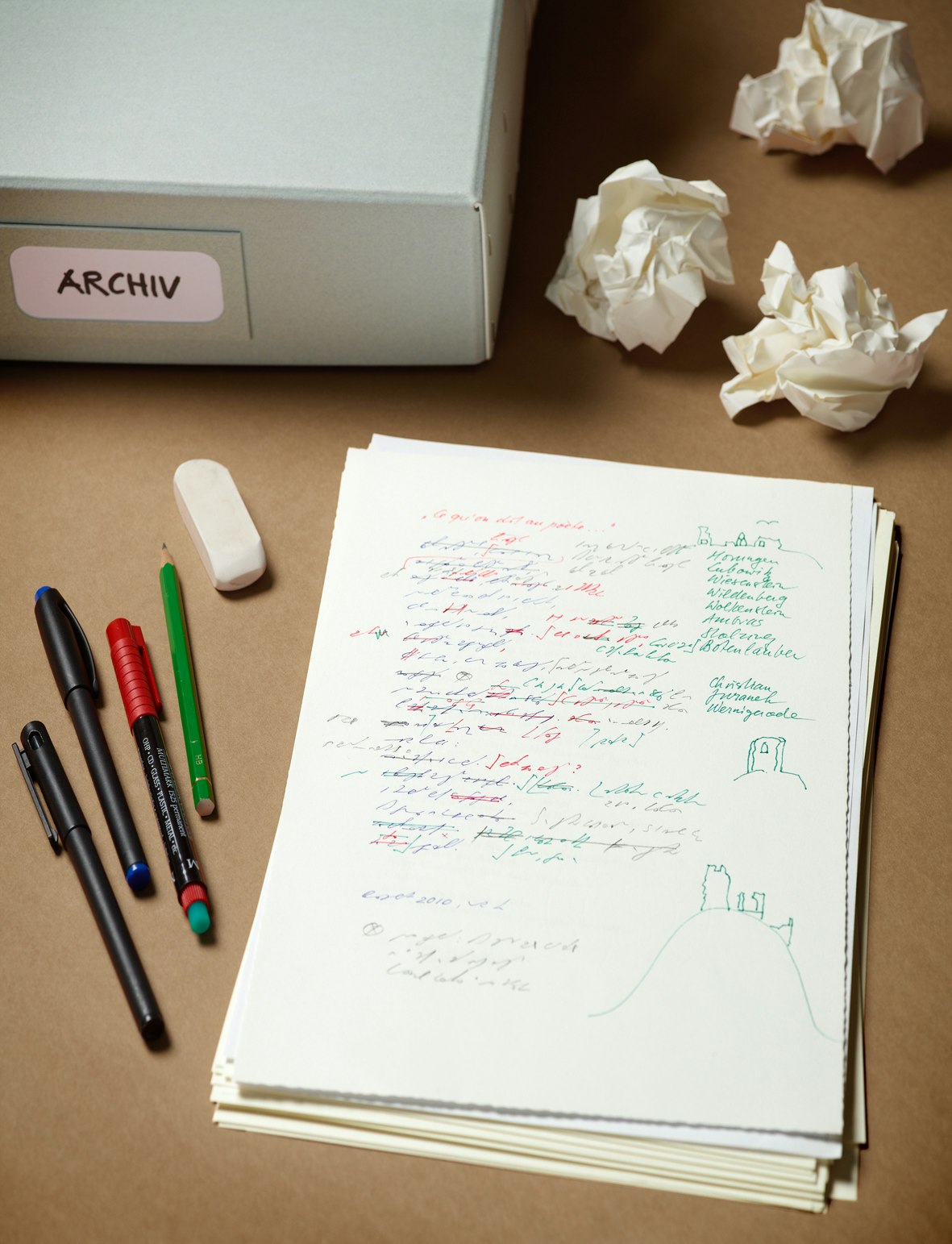 «Die drei Blätter geben sehr genau den Vorgang meiner Arbeit an einem Gedicht  wider. Eine mühselige Arbeit [...]»  (E-Mail vom 19. Januar 2011). Sie beginnt, absolut einmalig unter  den verschiedenen im SLA  dokumentierten Arbeitsformen,  in stenografierter Form, diese Version wird mit zwei bis drei Farben korrigiert und dann in den Computer getippt, wobei der definitiven Fassung weitere korrigierende  Arbeitsschritte  vorausgehen.