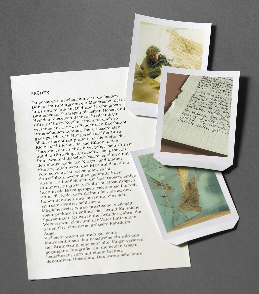 Mit der Beschreibung der Brüder beginnt ein neuer Roman: Dieser erste Entwurf basiert nicht auf Erlebnissen, sondern auf erinnerten Bildern. Die Buben sind im Stil der Zeit gekleidet, ihre Haltung verrät ihre Eigenarten. Lederhose und Matrosenbluse wechseln wie Alltag und Feiertag und weist auf sparsame Eltern hin, die nicht dem Wechsel der Moden folgen. Irritierend ist die Zusammenstelllung: Wie trägt sich ein Matrosenhemd über der Lederhose? Die Erinnerung zieht verlorene Fotografien zu einem Erinnerungsbild zusammen. Monate später fördert die Recherche im Familienarchiv die Fotos zutage und zeigt, was die Erinnerung zusammengeschoben hat.