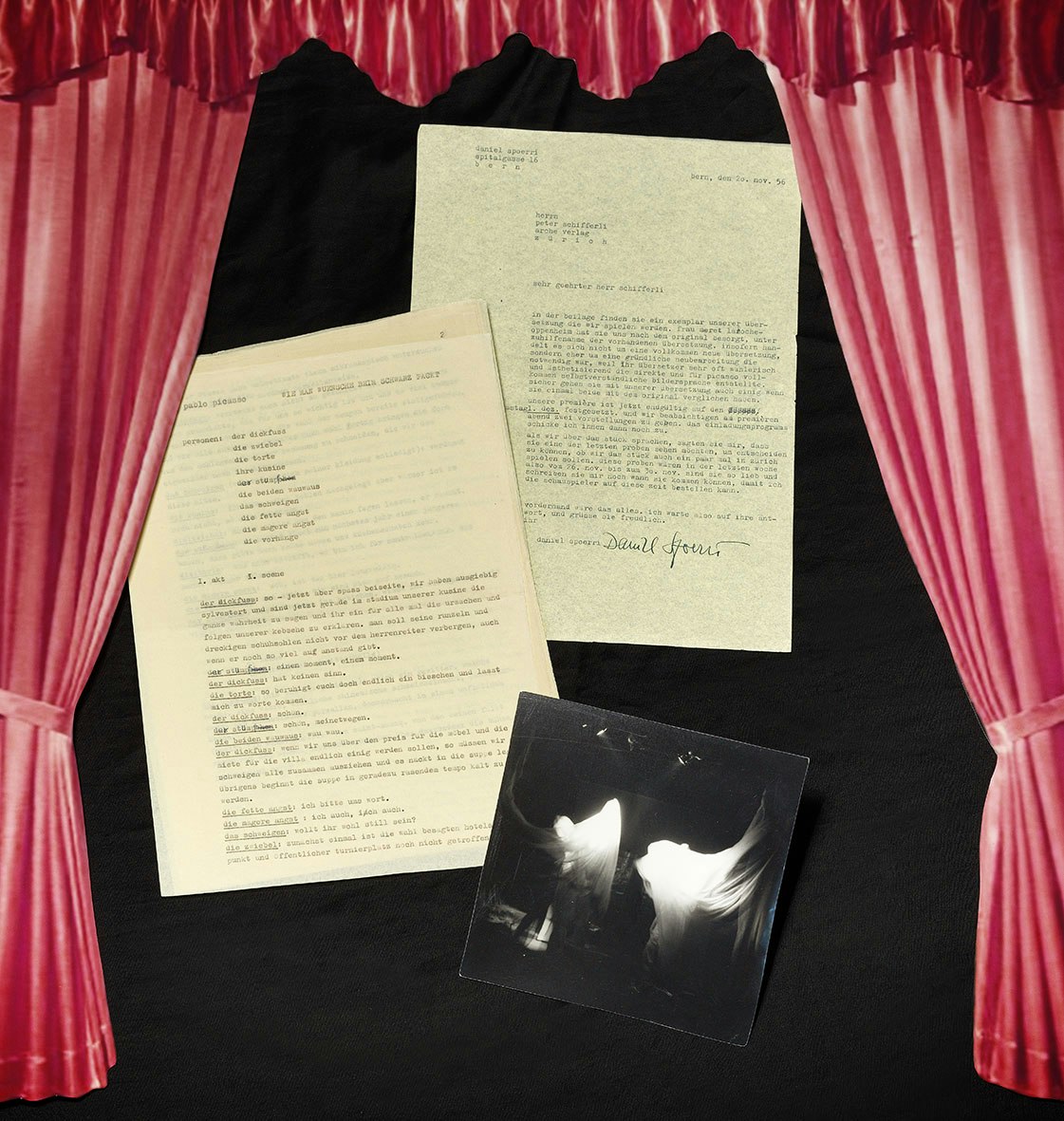 Es existiert also noch eine andere Übersetzung des Theaterstücks von Picasso, auch Meret Oppenheim hat es ins Deutsche übertragen. Meret Oppenheim war nicht nur als bildende Künstlerin aktiv, sie war auch literarisch tätig, hat bildende Kunst und Literatur in ihrem Schaffen immer wieder kombiniert. Schon früh hat sie etwa ihre Träume aufgezeichnet oder Gedichte geschrieben, die Titel ihrer Kunstwerke haben oft literarische Qualität. Der Text ihrer Picasso-Übersetzung galt lange Zeit als verschollen. In den Beständen der Schweizerischen Nationalbibliothek (NB) finden nun alle diese Dokumente wieder zusammen. Erst kürzlich ist das Typoskript der Oppenheim-Übersetzung im Archiv des Arche-Verlags wieder aufgetaucht, welches das Schweizerische Literaturarchiv (SLA) 2011 übernommen hat. Im Nachlass von Meret Oppenheim findet sich ein Foto zu Spoerris Inszenierung, das Meret Oppenheim und Lilly Keller in der Rolle der Gardinen aus dem Stück zeigt. Im Archiv von Daniel Spoerri in der Graphischen Sammlung der NB ist ein Plakat der Inszenierung erhalten geblieben, das auch den Eintrittspreis und die exakte Dauer der Inszenierung angibt: 48 Minuten und 40 Sekunden Picasso für 3 Franken.