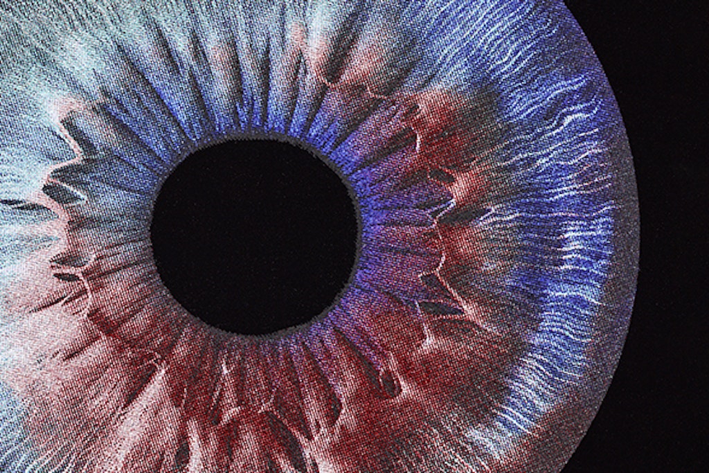 With the additive RGB four-colour printing process, Lorenz Boegli has come up with an innovation that inverts the well-known four-colour CMYK printing method in cyan, magenta, yellow and black (key). Both forms of multi-colour printing require a decomposition of the print design into individual colour separations. This can be seen in the screen print “Iris”, produced in 2024. The colour control strips on the right-hand edge of this print show that it was printed in red, green, blue and white. A close-up view of the same print reveals the fine dots in red, green, blue and white produced by the screen structure. The motif of the iris again points to human colour perception, which is based on the sensory cells for red, green and blue.