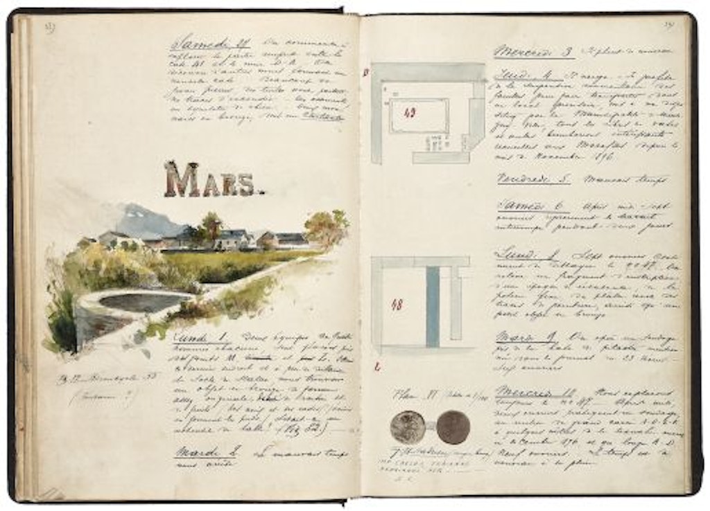- Procès-verbaux et carnets de notes manuscrits des premiers temps de la protection des monuments historiques, soigneusement illustrés de relevés passés à l’aquarelle.