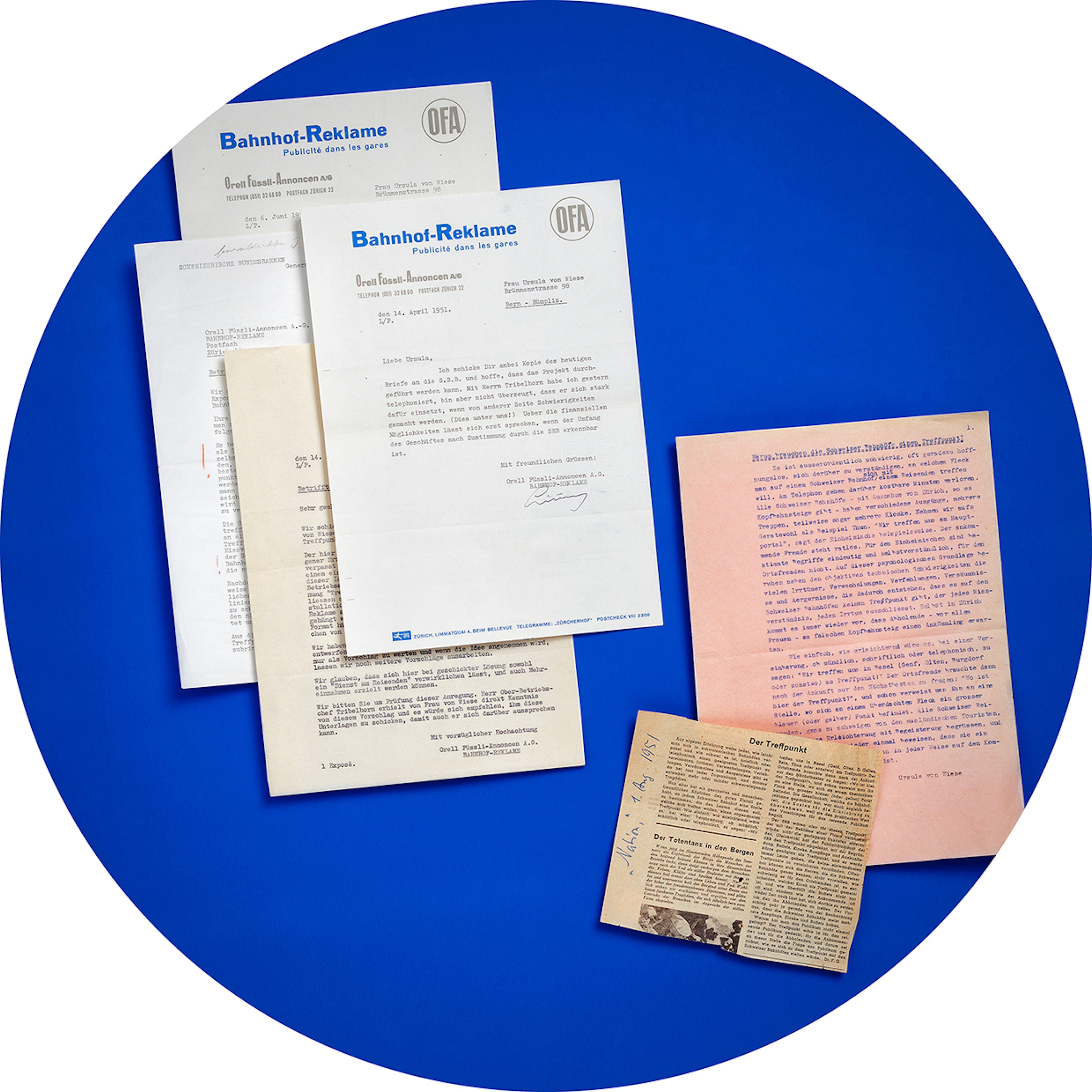 Im Doppelnachlass von Ursula von Wiese und Werner Johannes Guggenheim, der seit Ende 2016 im Schweizerischen Literaturarchiv konsultierbar ist, befindet sich ein unscheinbares Dossier, das zeigt, wie Ursula von Wiese bereits 1951 die SBB davon zu überzeugen versuchte, an den Bahnhöfen einheitlich ausgeschilderte Treffpunkte einzuführen. Sie wandte sich mit dem Anliegen nicht direkt an die SBB, sondern an die Orell-Füssli-Annoncen AG, welche für die Reklame an den Bahnhöfen verantwortlich war. Werbung an den Treffpunkten sollte zusätzliche Einnahmen generieren und so die Installation der Treffpunkte finanzieren. Die Orell-Füssli-Annoncen AG war von der Idee überzeugt und leitete den einseitigen Text «Warum brauchen die Schweizer Bahnhöfe einen Treffpunkt?» von Ursula von Wiese an die SBB weiter. Es sei «ausserordentlich schwierig, oft geradezu hoffnungslos, sich darüber zu verständigen, an welchem Fleck man auf einem Schweizer Bahnhof sich mit einem Reisenden treffen will». Wieviel einfacher wäre es hingegen, wenn man sich – unabhängig davon, um welchen Bahnhof es sich handelt – einfach am sogenannten Treffpunkt verabreden könnte? Ortsfremde müssten sich so nur erkundigen, wo sich dieser befinde, und schon würden sie auf eine Stelle verwiesen, «wo sich an einem überdachten Fleck ein grosser blauer (oder gelber) Punkt befindet». Ein Blick auf die heute etablierten Treffpunkte zeigt, wie ähnlich sich Ursula von Wieses Vision und die heute bestehenden Umsetzungen sind. In Bern befindet sich das blau-weisse Piktogramm zentral in der Bahnhofshalle, darum herum irren meist noch wartende oder schon vereinte Menschen.