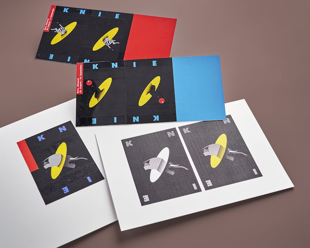 Les différentes étapes de la création de l’affiche conçue pour le cirque Knie sont très révélatrices de la façon de travailler de Claude Kuhn: sur un fond de couleurs clairement définies, il place différentes formes qui interagissent entre elles. Trois variantes, avec trois animaux différents, ont été envisagées: celles du zèbre guillotiné par le disque jaune et de l’otarie noire qui semble être engloutie par l’arrière-plan ont finalement été écartées au profit de notre éléphant, qui se révèle effectivement être le choix correspondant le mieux au contexte.