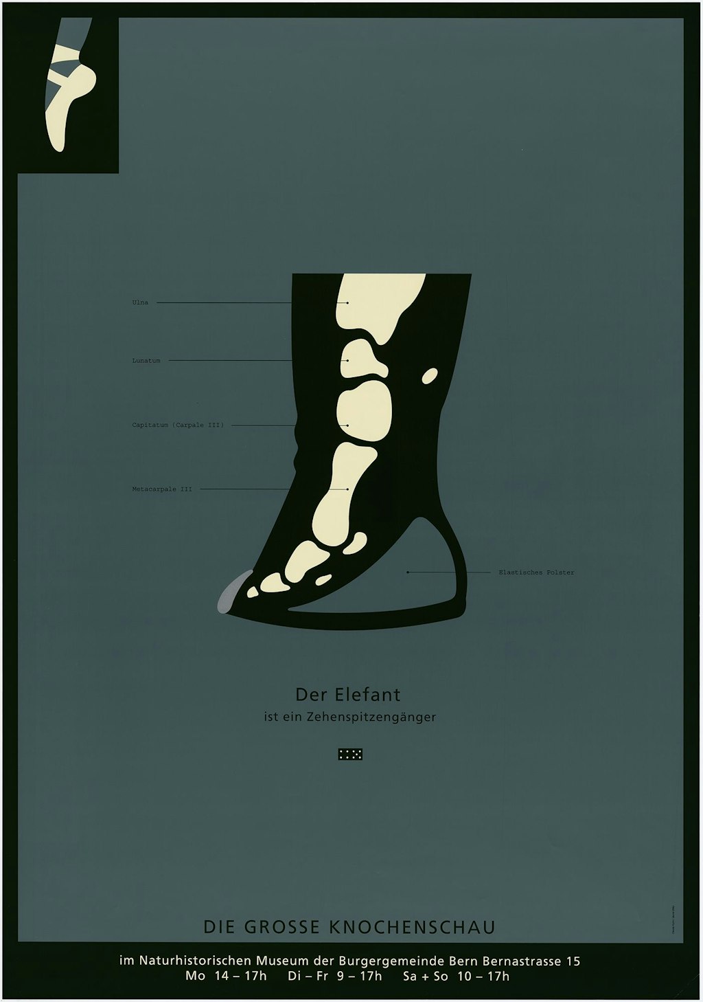 Les affiches de Claude Kuhn sont peuplées de toutes sortes d’animaux, qui réapparaissent dans des contextes différents, au gré des travaux de l’artiste: la grenouille et le lièvre, le serpent et le papillon. L’éléphant connaît lui aussi divers avatars dans le zoo illustré de Kuhn. Totalement exotique dans la faune européenne, il occupe naturellement une place à part. Et la main sensible de Claude Kuhn y fait honneur dans l’affiche de l’exposition du Musée d’histoire naturelle de Berne: le lourd pachyderme se mue en un élégant danseur de ballet tout fier de faire des pointes.