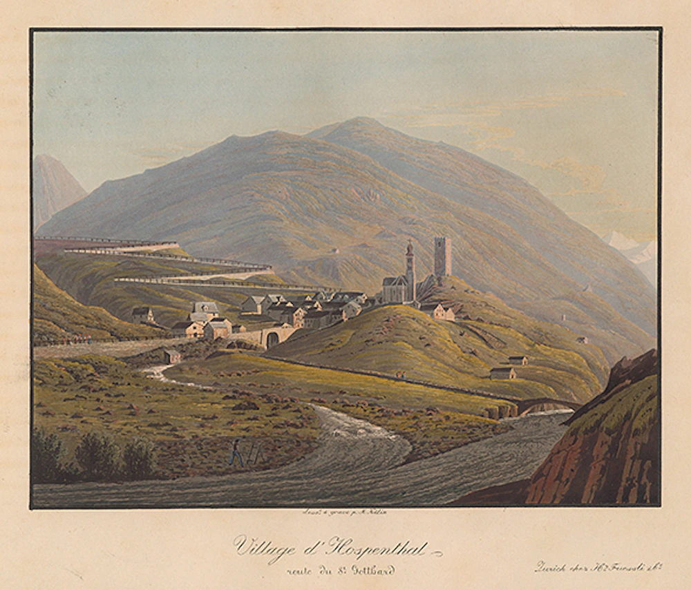 Le premier plan de cette gravure de Joseph Meinrad Kälin, publiée en 1833, représente le confluent de la Furkareuss et la Gotthardreuss, que domine la célèbre tour d'Hospental. A l'arrière-plan à gauche, on perçoit les premiers virages en lacets de la nouvelle route menant au col du St-Gothard. Le début du XIXe siècle est en effet l'époque de la construction, pour des questions stratégiques et économiques, de nombreuses voies carrossables transalpines. C'est d'abord la route du Simplon, souhaitée par Napoléon Bonaparte et inaugurée à l'automne 1805, puis les cols du San Bernardino et du Splügen, aménagés entre 1818 et 1823. Quelques années plus tard, entre 1827 et 1830, le sentier muletier du St-Gothard, longtemps seul axe de passage permettant de relier le canton d'Uri à la Léventine, est doublé par une route que fréquentent les diligences à la belle saison et les traîneaux en hiver.