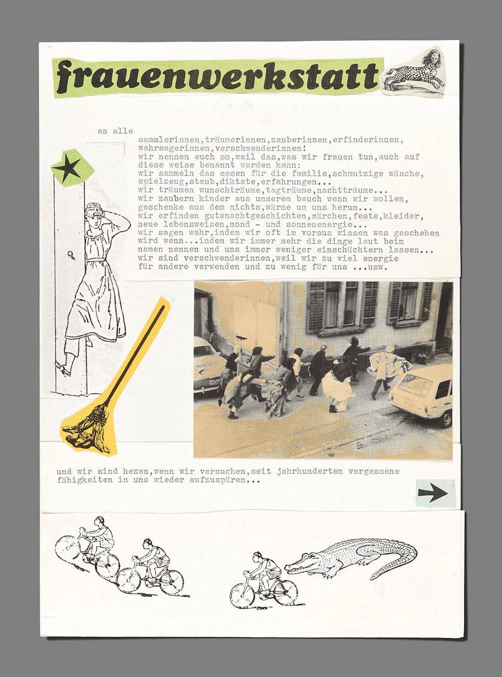 Dal 1977 propone alla F+F il «corso di stregoneria», rivolto esclusivamente alle donne e incentrato sullo scambio di esperienze, lo sviluppo della fiducia in sé e la scoperta della creatività. Durante il corso si fotografa, si fanno riprese, si danza e si racconta. Questo formato didattico esula però dal contesto della F+F e così nel 1978 l’artista affitta un locale in uno stabilimento industriale, dove continua a tenere i suoi corsi nel cosiddetto «Frauenwerkstatt», il laboratorio per le donne artefice dell’azione sui costumi da bagno.