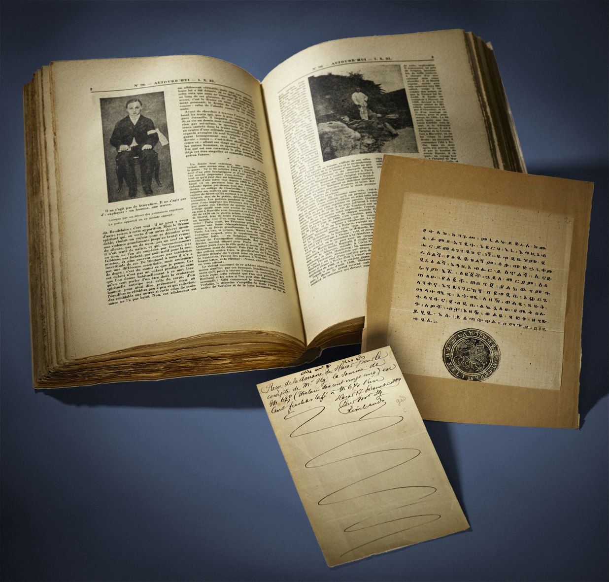 Fournisseur de Ménélik II, roi du Choa, qui l'entraîne dans des complications financières sans fin, Rimbaud traitait également avec son conseiller, l'ingénieur suisse Alfred Ilg, au nom duquel il signe le reçu de la douane du Harrar : l'original n'était plus localisé, le voici qui ressurgit du Fonds Mermod flanqué d'une lettre de Ménélik II, dans ces caractères ghèzes qui faisaient délirer Cingria.