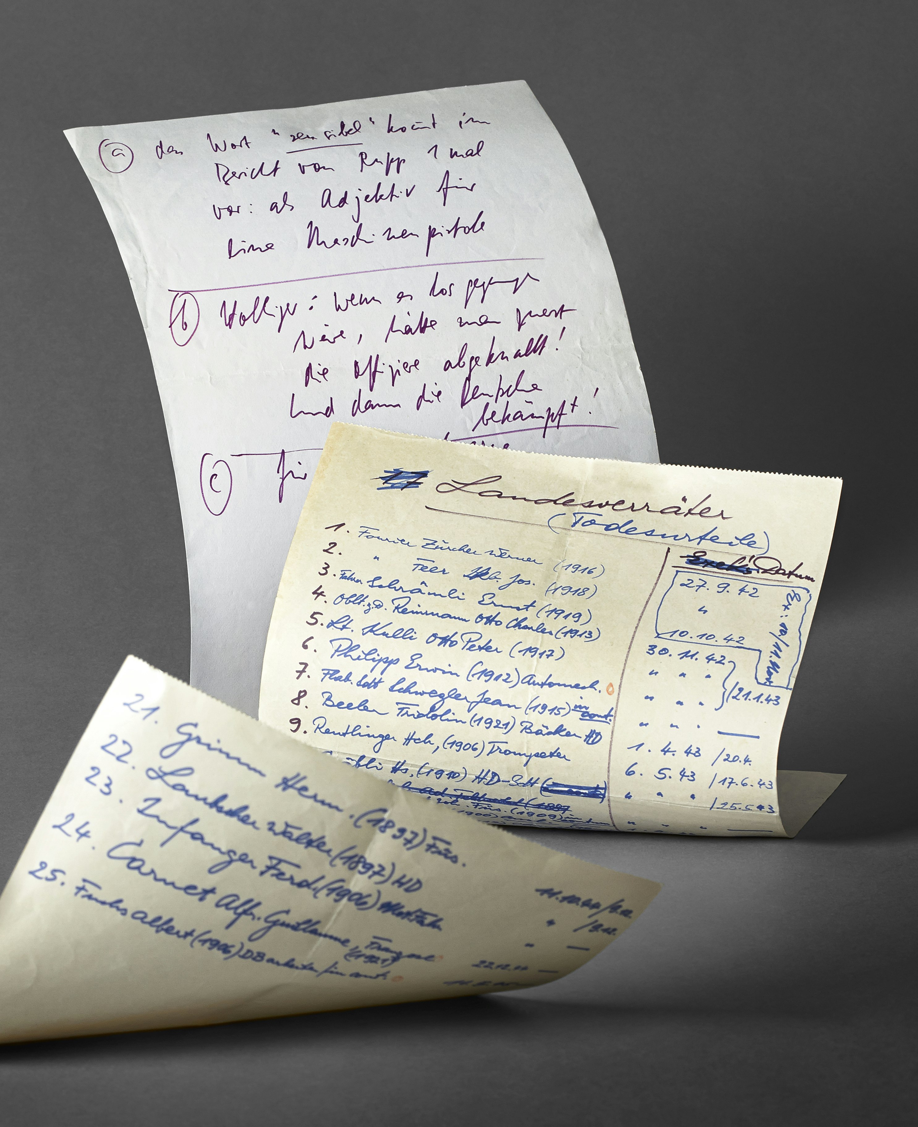 Quellennachweis: Aus dem Nachlass Meienbergs: Agenda 1963/64 (C-1/6) Listen, Notizen, Briefe und weitere Dokumente zum Thema Landesverrat (A-1-a/5 bis A-1-a/8), Tages-Anzeiger-Magazine Nr. 32/33 (D-1/5), Interview mit Meienberg/Dindo über den Film (D-1/5), Kopien von Meienbergs Fiche (C-1/15)