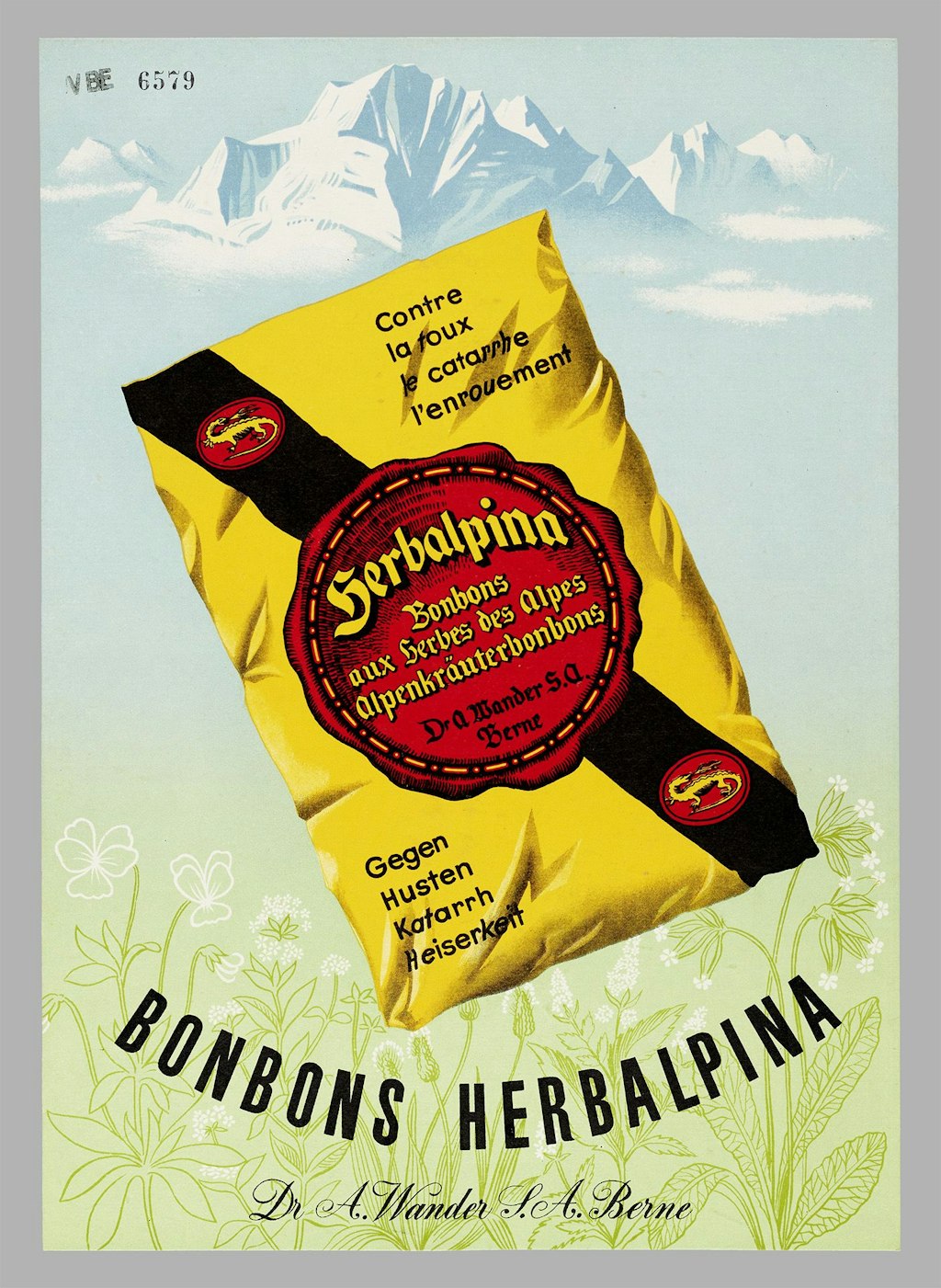 Sul cartello pubblicitario della caramella Herbalpina, la confezione fluttua sopra un prato fiorito, con la Jungfrau che troneggia imponente sullo sfondo. La caramella alle erbe, efficace contro tosse, catarro e raucedine, è immersa in un perfetto paesaggio montano. La raffigurazione delle erbe di campo e delle montagne crea un legame diretto con gli ingredienti delle caramelle contro la tosse.
