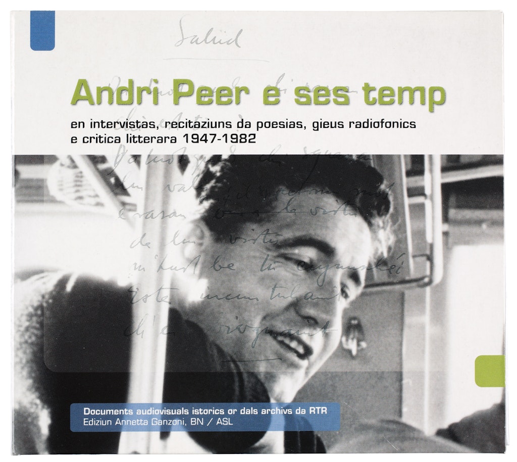 Andri Peer e ses temp en documents audiovisuals istorics. Intervistas, recitaziuns da poesias, gieus radiofonics e critica litterara (1947-1982) or dals archivs da Radio e Televisiun Rumantscha, ed. Annetta Ganzoni, Berna, BN/ ASL, 2008.