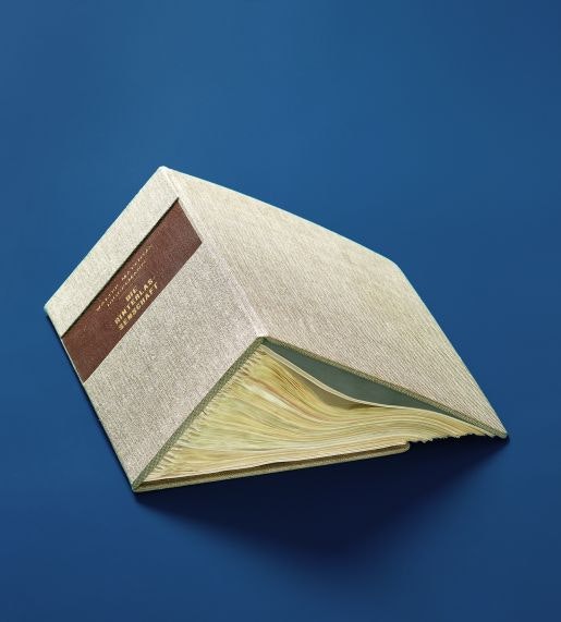 Ein leinengebundenes Satteldach ist nicht eben die klassische Form eines Buches, selbst wenn darunter an die dreihundert maschinengeschriebene Seiten versammelt sind. Obschon die 36 Bögen fein säuberlich von Hand mit Fadenheftung eingebunden sind, ist das Typoskript keine dienliche Druckvorlage: unregelmässige, ja chaotische Seitenzählung, mit Bleistift teilweise nochmals neu nummerierte Teile; zahlreiche handschriftliche Korrekturen, die sich über den abgetippten Text lagern, dazwischen eingeklebte Streifen und ganze Absätze, die deutlich zu erkennen von anderen Druckvorlagen stammen.